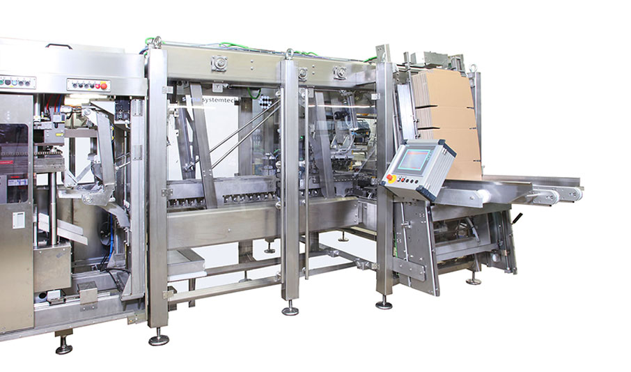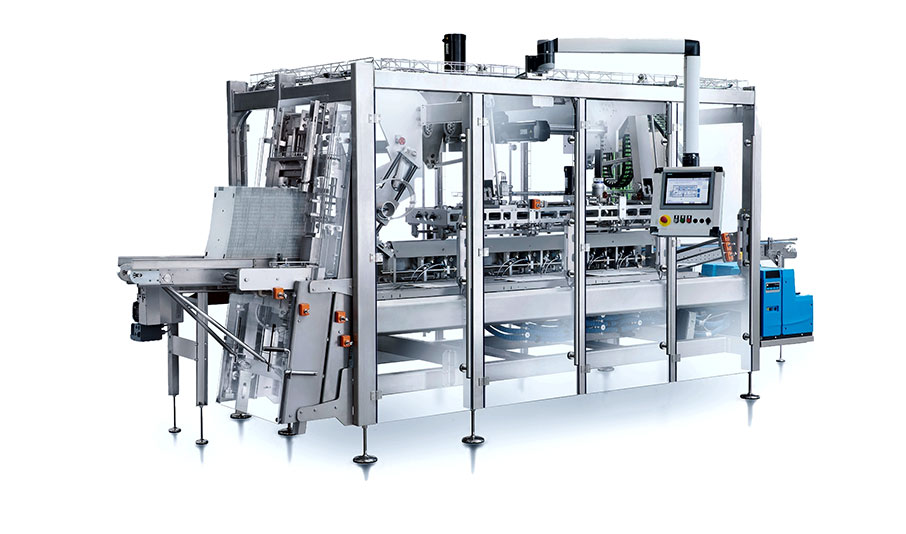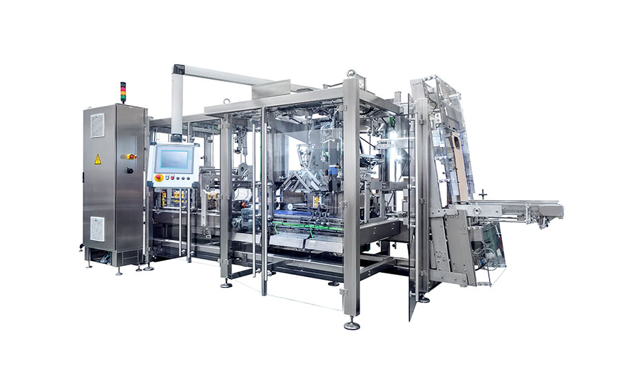 Zur Produktübernahme direkt aus der Füllmaschine ohne Transportbänder.Wrap-Around-Packer 3100 i